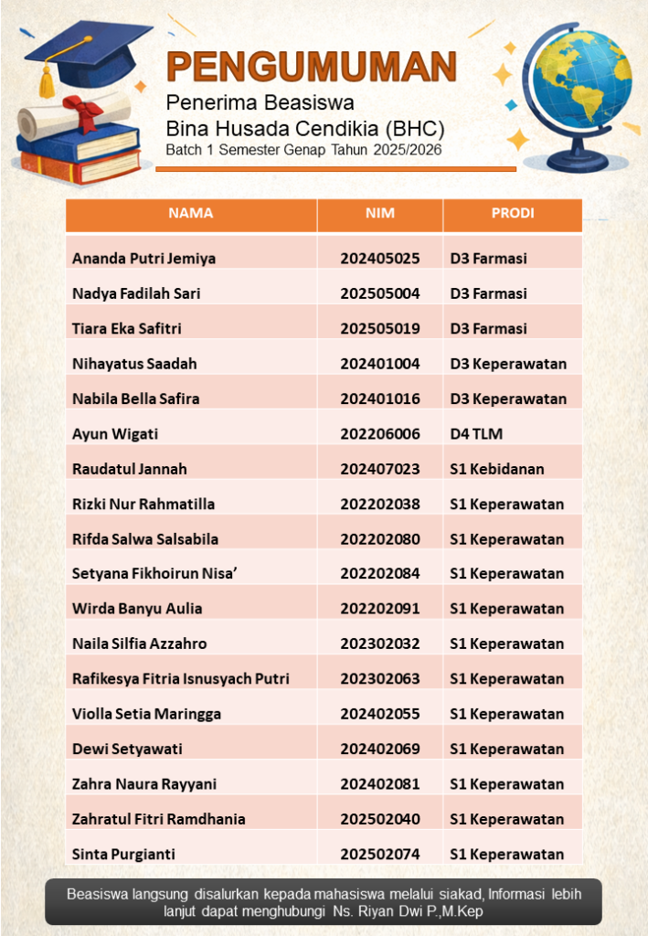 Berikut kami umumkan penerima Beasiswa Bina Husada Cendikia (BHC) Batch 1 Semester Genap Tahun 2025/2026 Universitas Dr. Soekardjo
